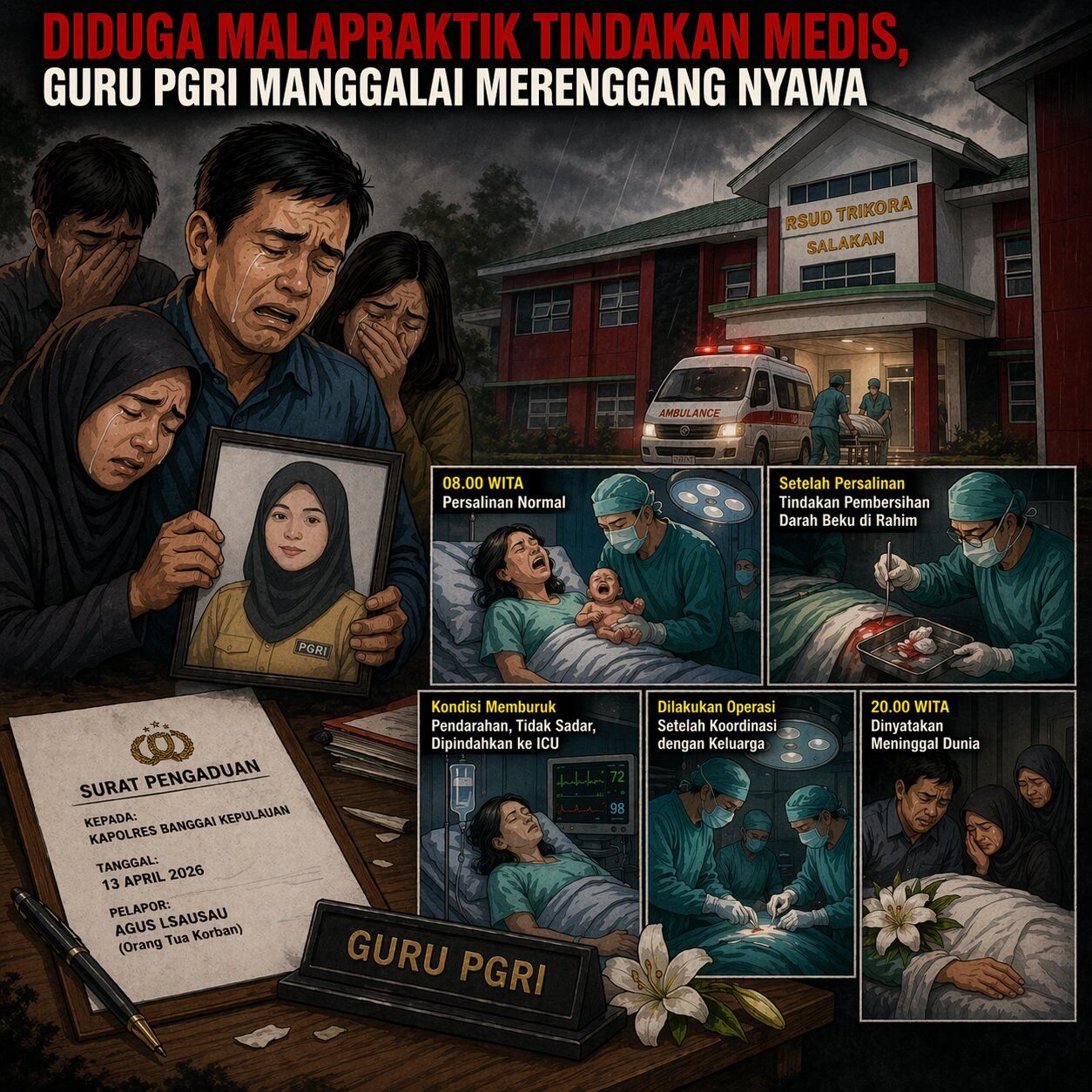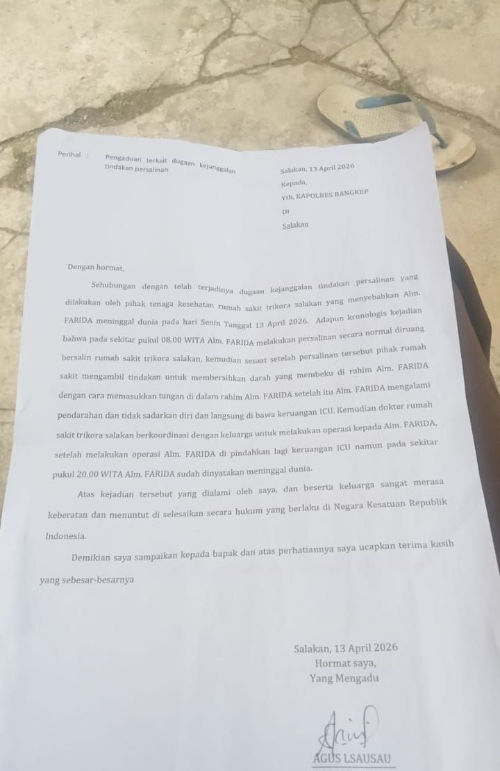 Laporan pengaduan itu ditujukan kepada Kapolres Banggai Kepulauan pada 13 April 2026. Dalam surat pengaduan, keluarga menyampaikan keberatan atas rangkaian penanganan medis yang dialami korban hingga akhirnya dinyatakan meninggal dunia pada sekitar pukul 20.00 WITA.